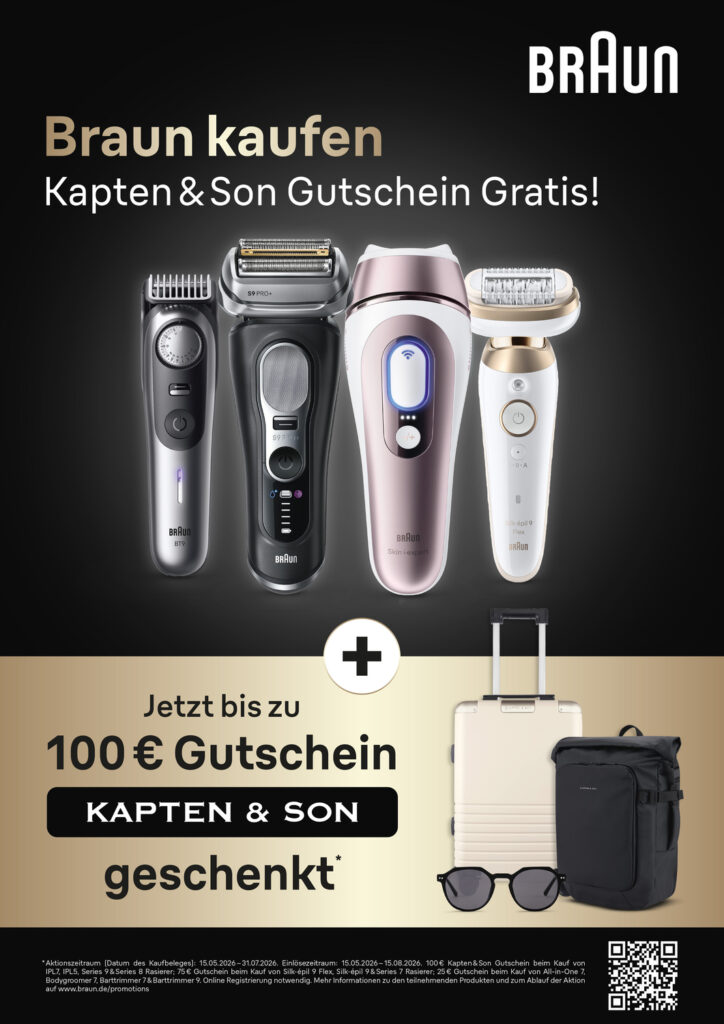 Braun kooperiert im zweiten Quartal mit der angesagten Lifestyle‑Marke Kapten & Son und bringt damit echtes Summer Feeling in den Alltag. Die attraktive Promotion rund um Rasur, Styling und Haarentfernung unterstützt Verbraucher dabei, gepflegt und stilvoll in die warme Jahreszeit zu starten. Wer zwischen dem 15. Mai und 31. Juli 2026 ein Braun Aktionsprodukt kauft, wird mit einen Kapten‑&‑Son‑Gutschein im Wert von bis zu 100 Euro belohnt – perfekt, um den eigenen Sommer‑Look mit trendigen Accessoires abzurunden. Die Registrierung zur Teilnahme ist bis zum 15. August 2026 möglich. Für maximale Sichtbarkeit am PoS stellt Braun hochwertige Werbematerialien bereit – zusätzlich wird die Aktion durch gezielte Online‑Aktivitäten verlängert.
